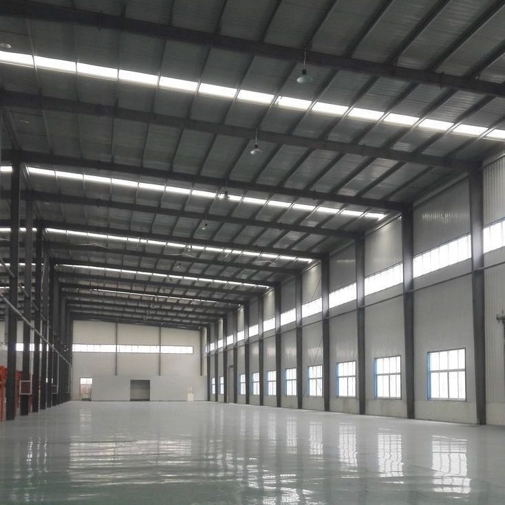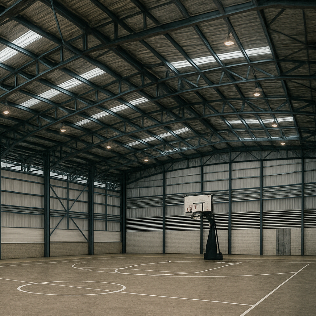 - Atap: Rangka baja + penutup galvalume/zincalume dengan insulasi panas & skylight