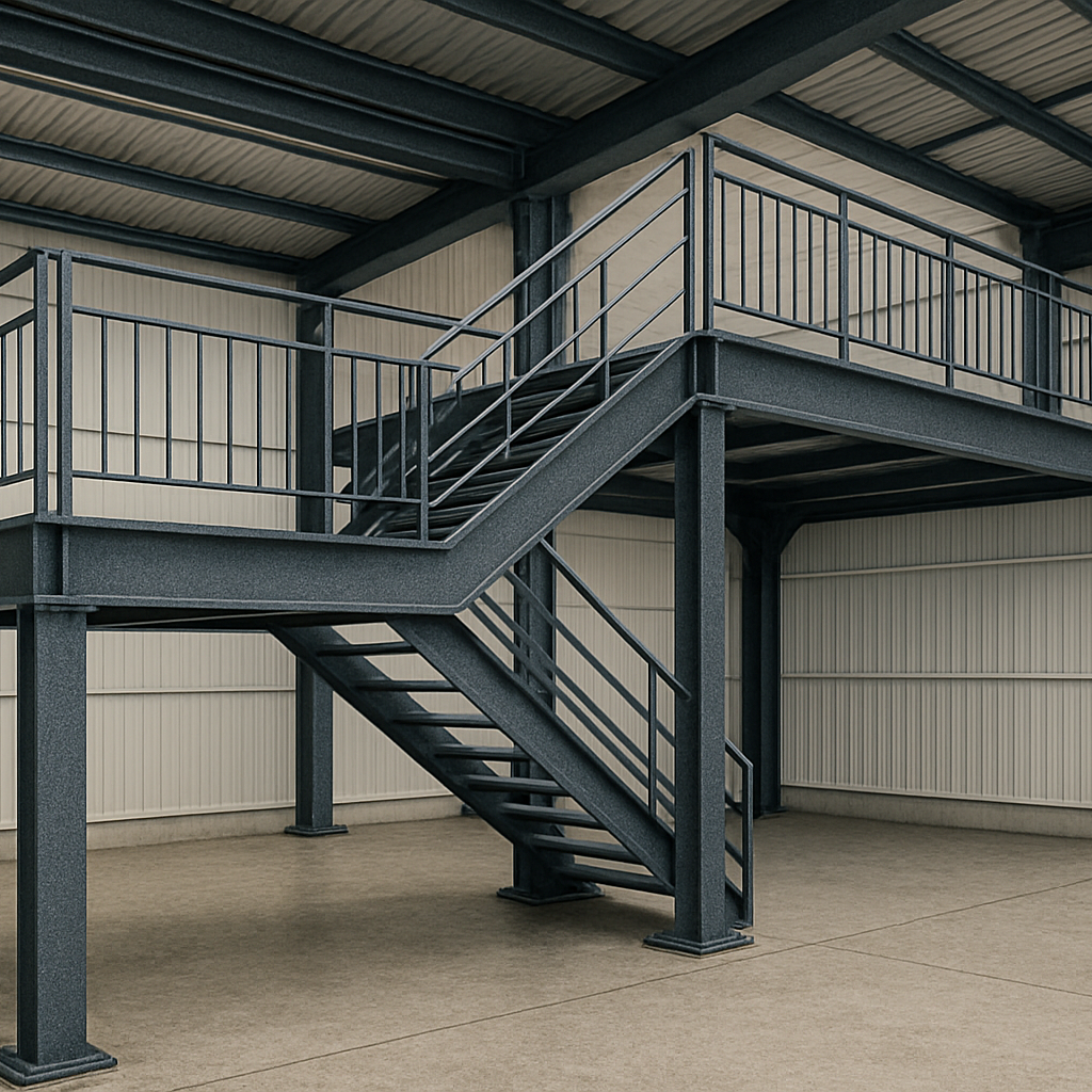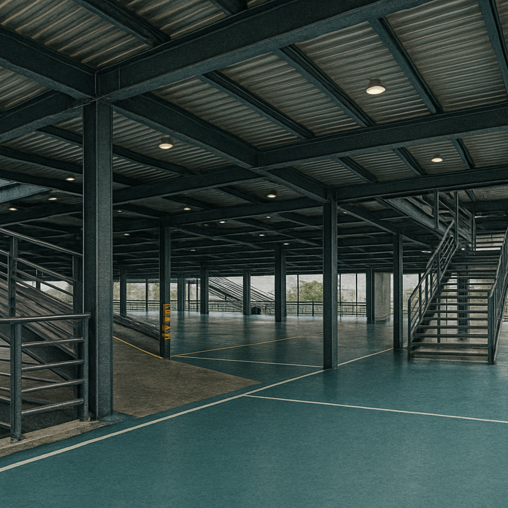 - Lantai Mezzanine: Plat baja + bondek + cor beton bertulang atau multiplek/board sesuai kebutuhan beban.